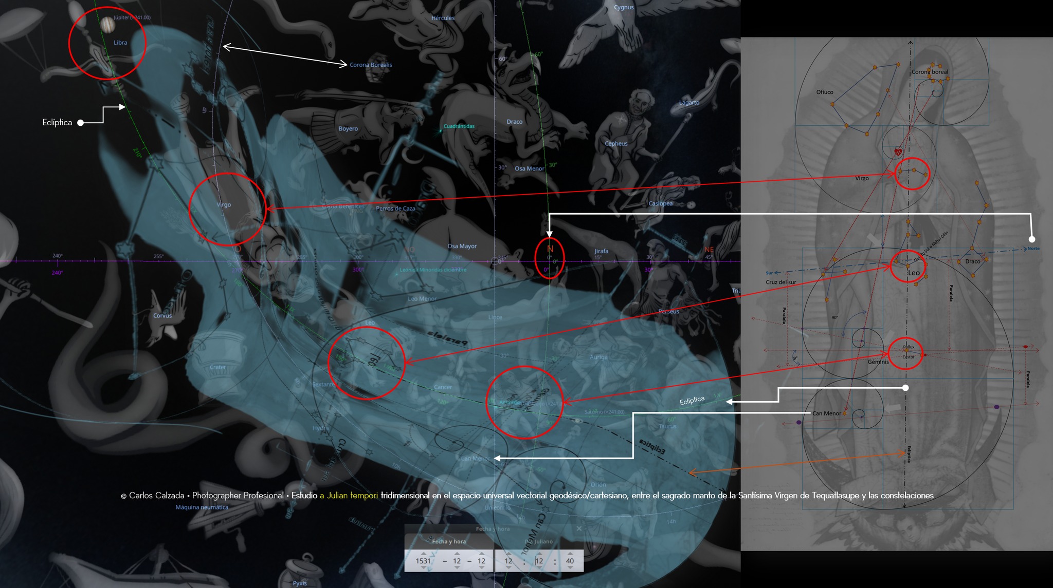 2.- La coincidencia de las constelaciones cae exactamente en la fecha y hora del suceso que se comprueba exactamente, ya que extraje la santísima imagen y solo deje el manto sagrado, haciendo el mismo de forma anamórfica y geodésica, misma imagen, que esta con baja intensidad para sobreponerla sobre el resultado cartesiano/geodésico de las constelaciones y de fecha juliana del evento.