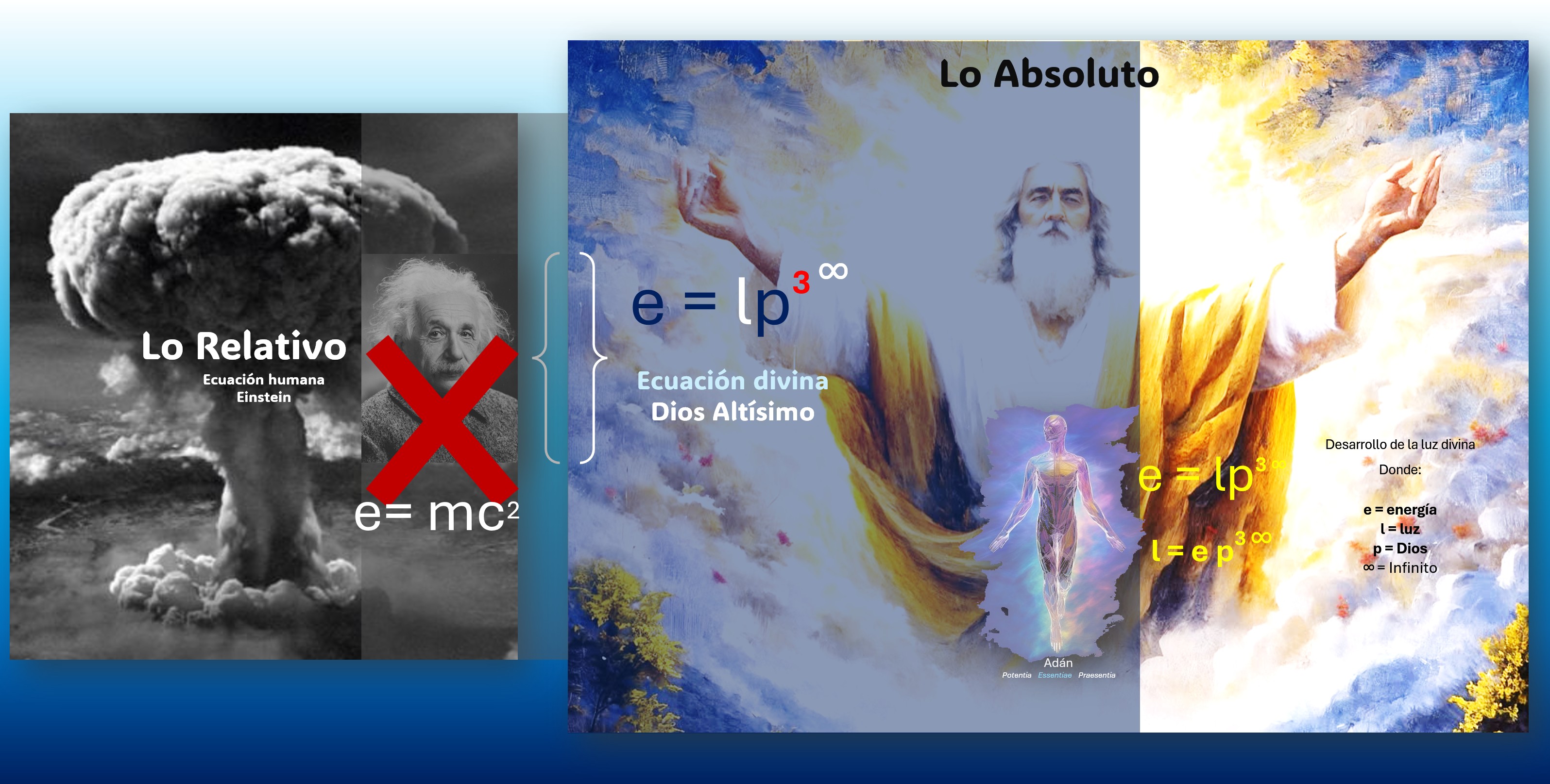 Contrario a esa ecuación demoniaca y por demás maléfica (esto por todo lo que ha provocado su desarrollo), se encuentra la ecuación divina que, en lugar de la masa molecular de cualquier cuerpo físico, se encuentra la atomicidad cósmica de la luz, que aunque no tiene peso molecular, si que lo tiene en peso nano-atómico-cuántico, claro que si existirá un aparato para cuantificar este dato que, una vez obtenido, debe de multiplicarse por la unidad de Potencia divina y el resultado debe de ser elevado a la tercera potencia en su infinito superíndice, como un número cuántico, irracional e infinito como lo es el valor de π (pi).