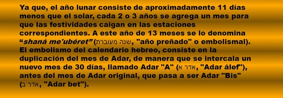 El primer precepto que Dios dio al pueblo judío fue el de establecer el calendario sobre el ciclo lunar[3]. Los meses y, como consecuencia de ello, las fechas y las festividades habrán de fijarse según el ciclo lunar. El tema es que también hay un mandato Divino de asegurar que la celebración de Pésaj coincida siempre con la primavera[4] para recordar la bondad de Di-s que nos sacó de Egipto en primavera, para que no suframos el frío del invierno ni el calor del verano. ¿Cómo se logra esto, si el año lunar tiene unos once días menos que el año solar? Los que prestan atención a las noticias que mencionan el mes de Rámadan, se darán cuenta que cada año coincide con otra estación del año. El islam, que basa su calendario en el ciclo lunar, pierde unos once días cada año con respecto al año solar y así resulta que las fechas van traslándose por las diferentes estaciones. ¿Cómo lo logramos, entonces? Para lograr el resultado buscado agregamos un mes entero (Adar II) cada dos o tres años y así compensamos el desfasaje entre los dos sistemas.